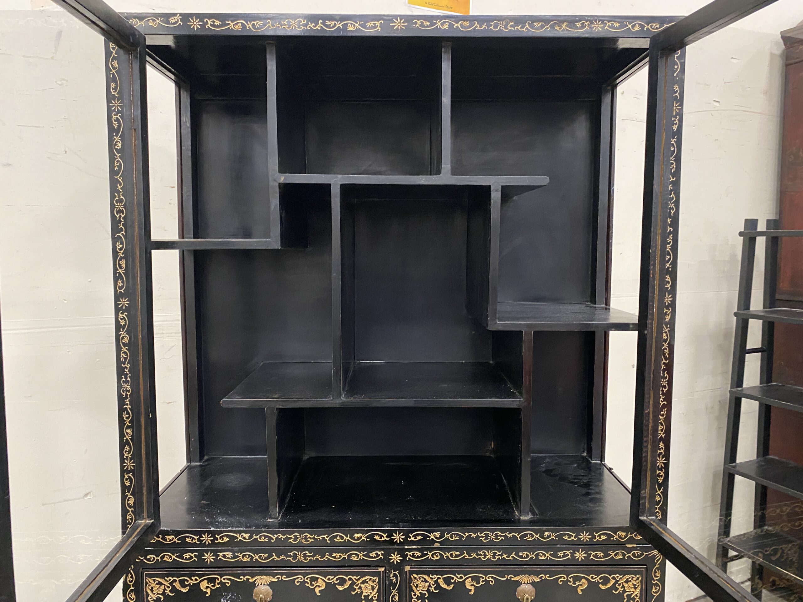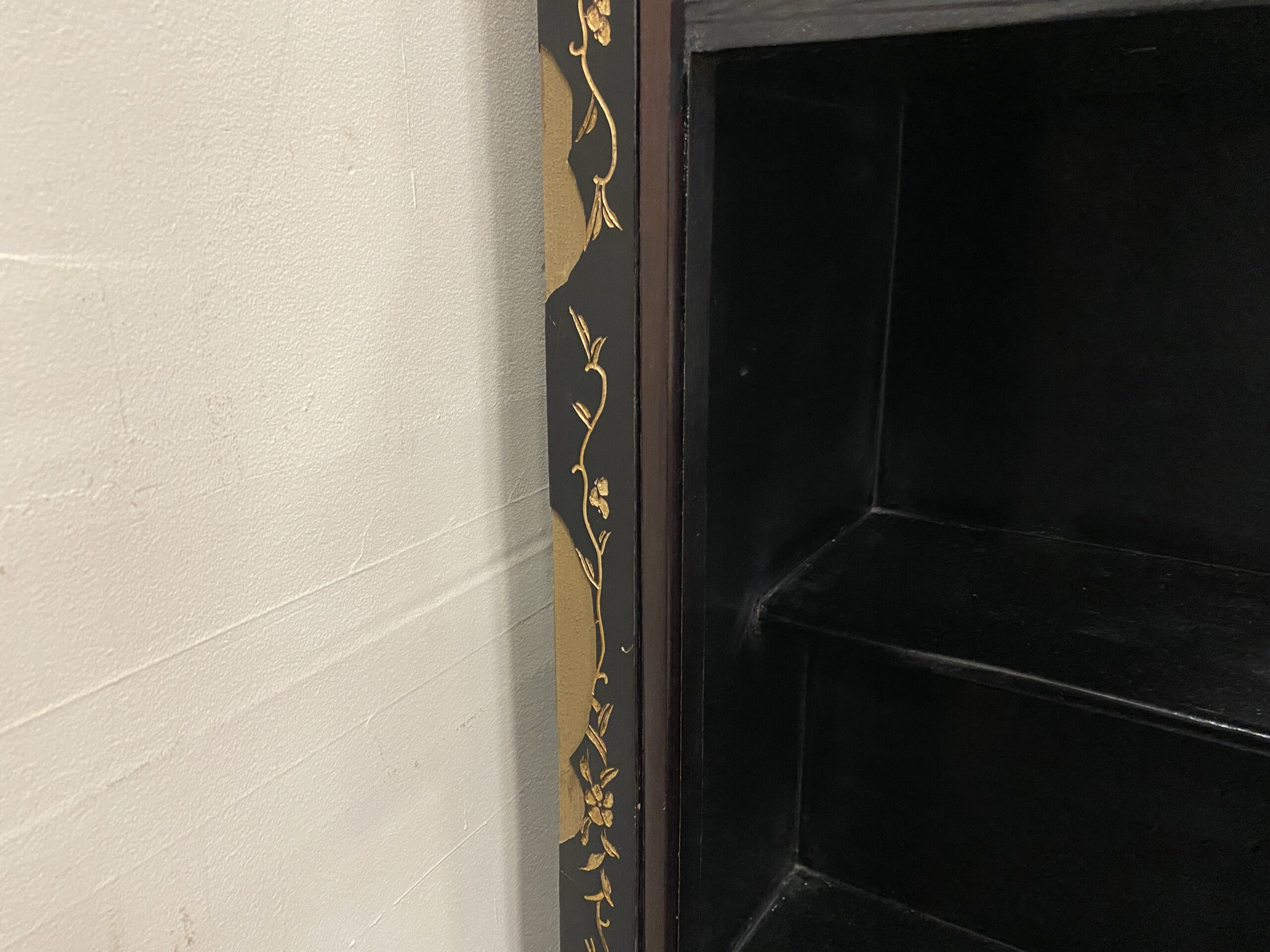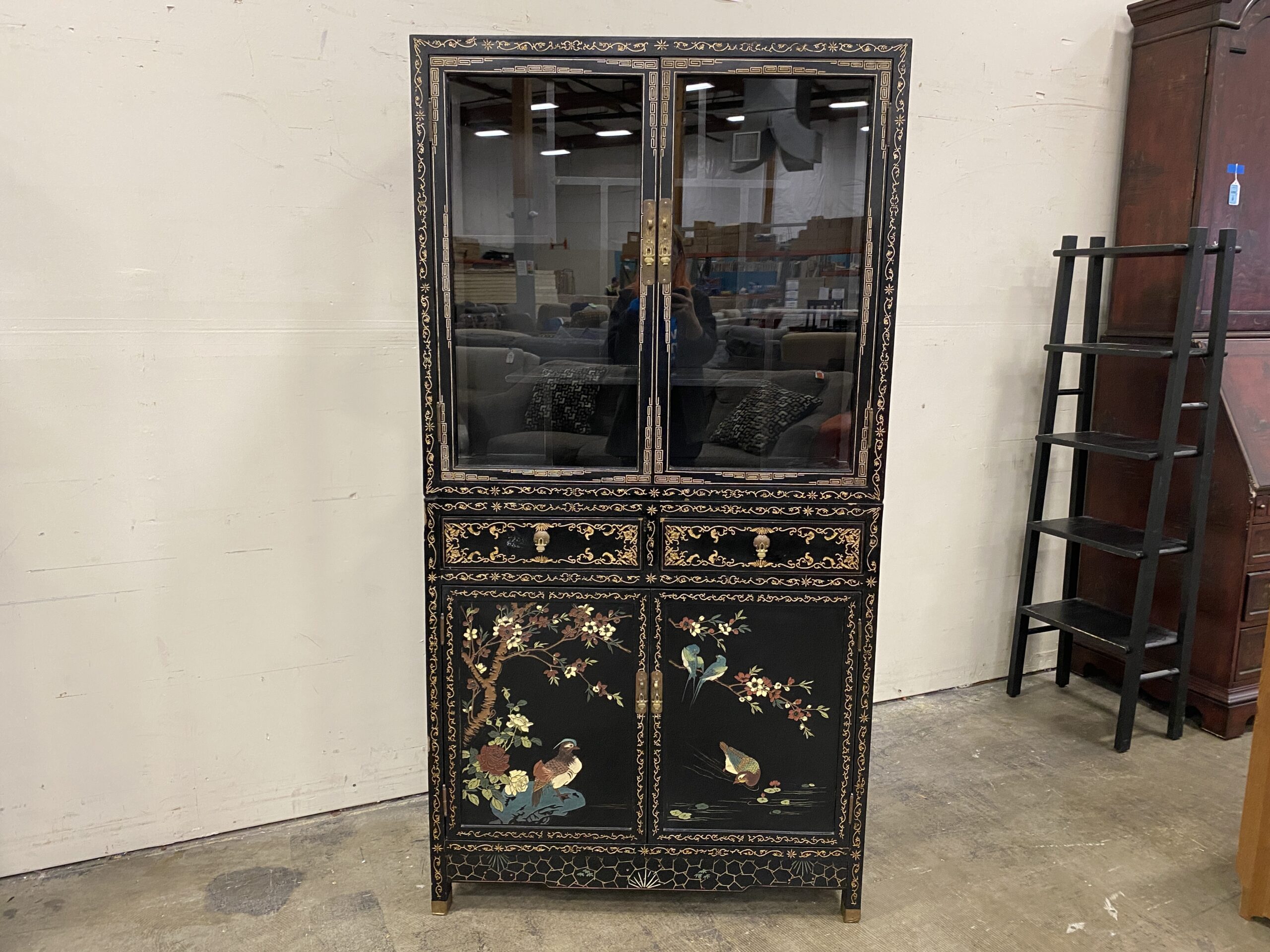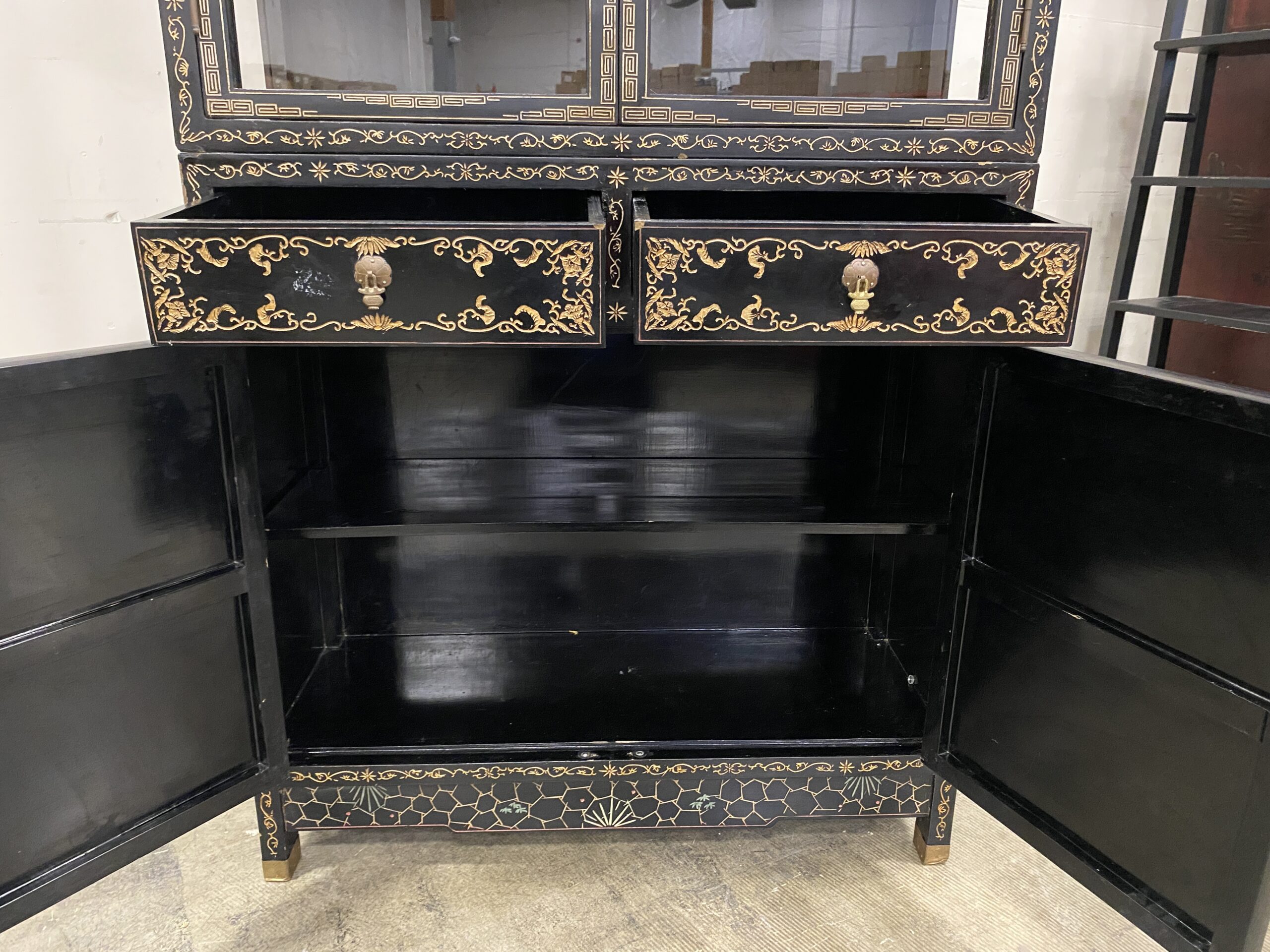 Black and Champagne Chinoiserie China Hutch with Glass Doors and Painted Details