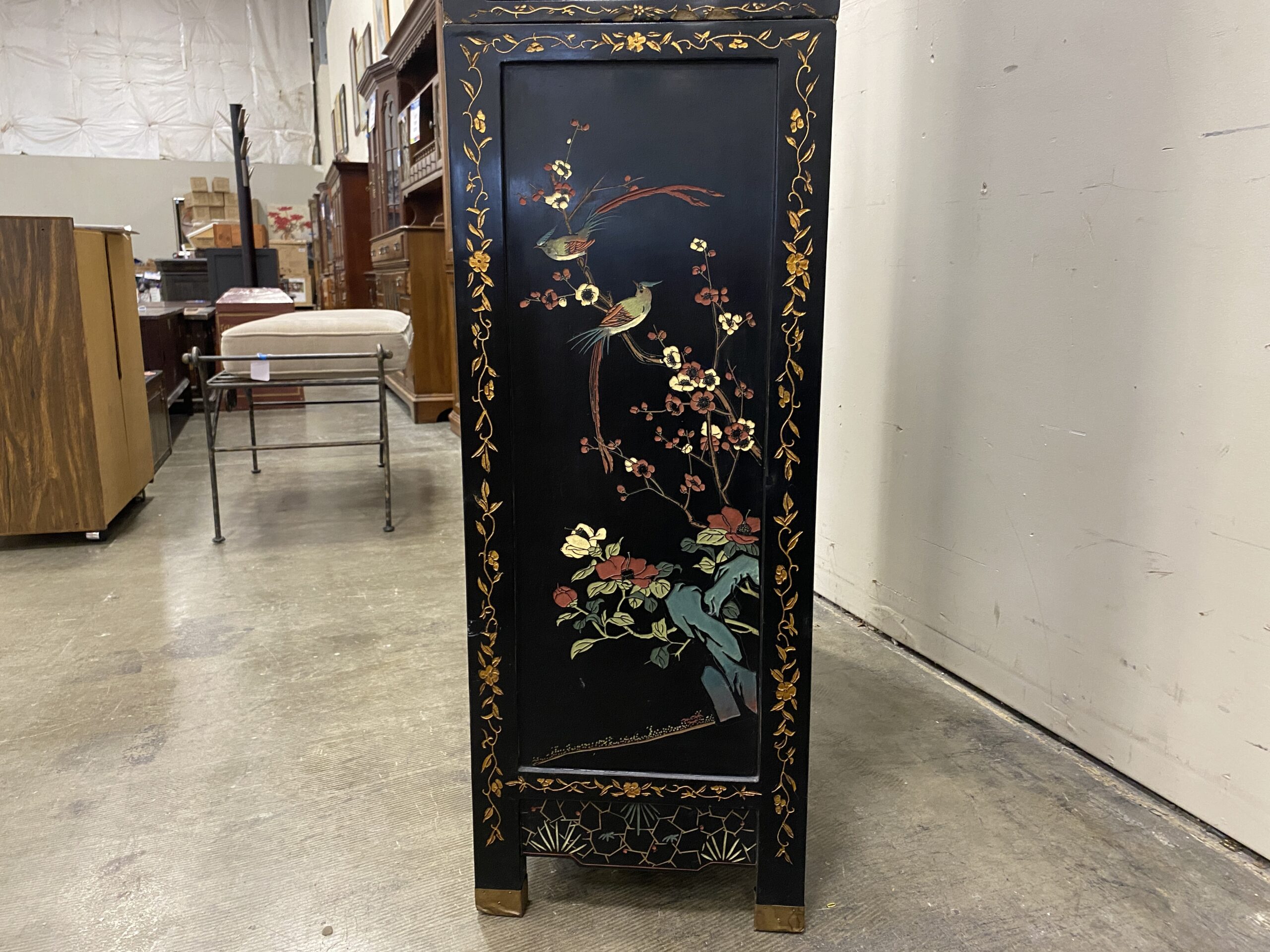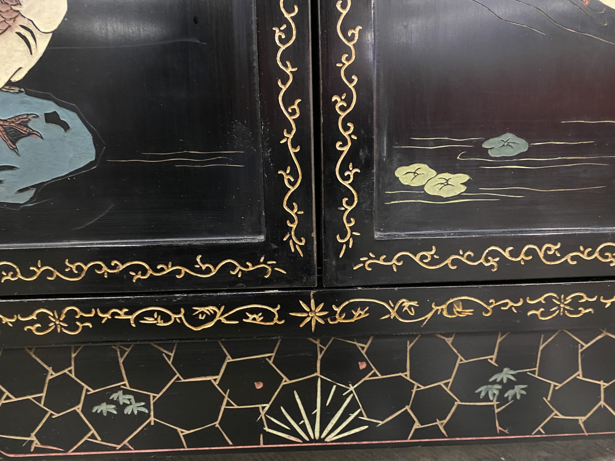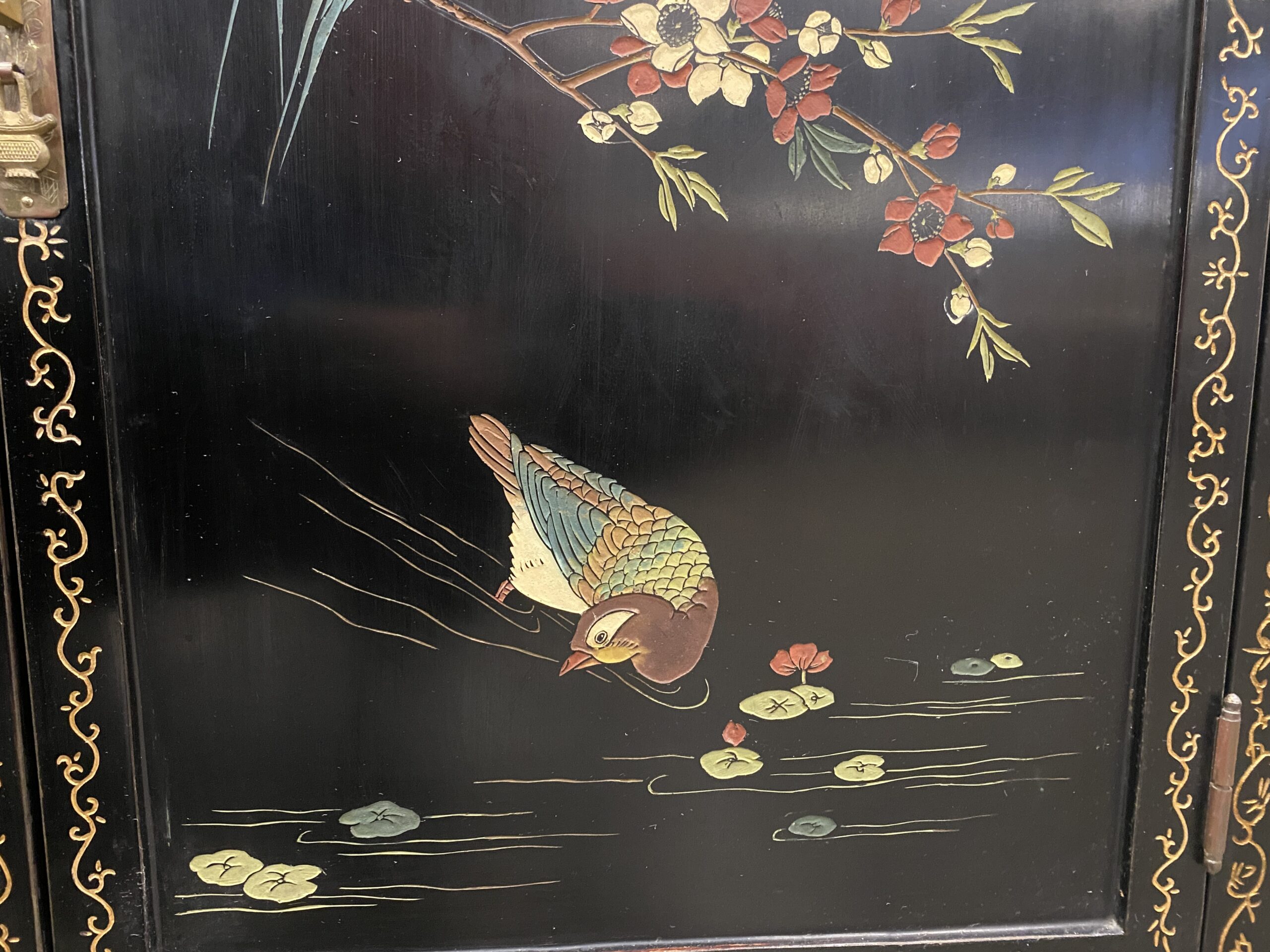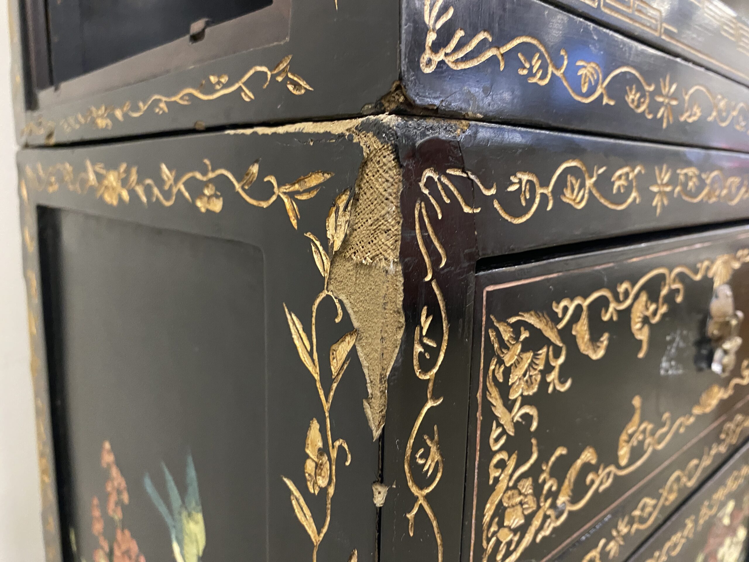 Black and Champagne Chinoiserie China Hutch with Glass Doors and Painted Details