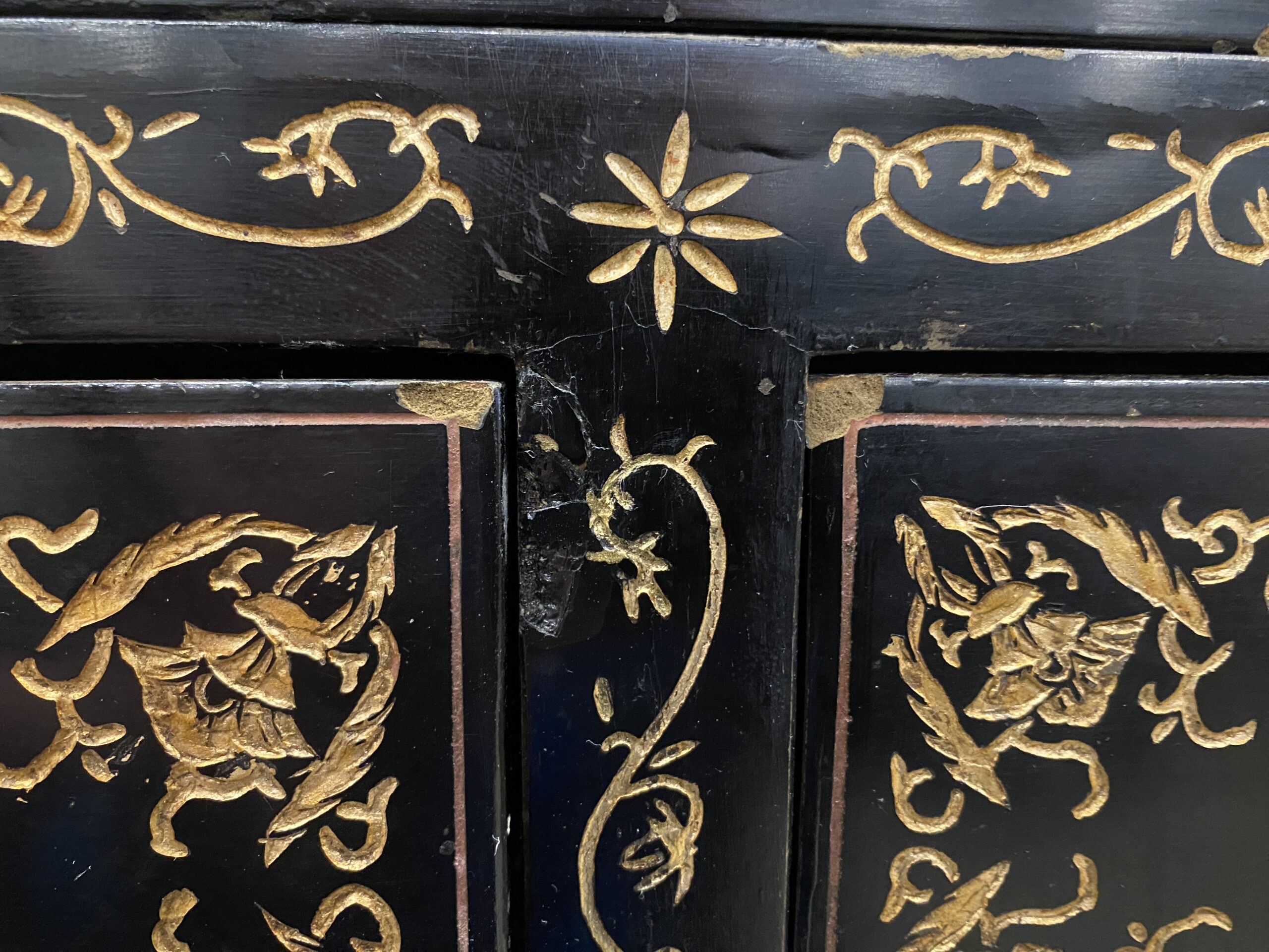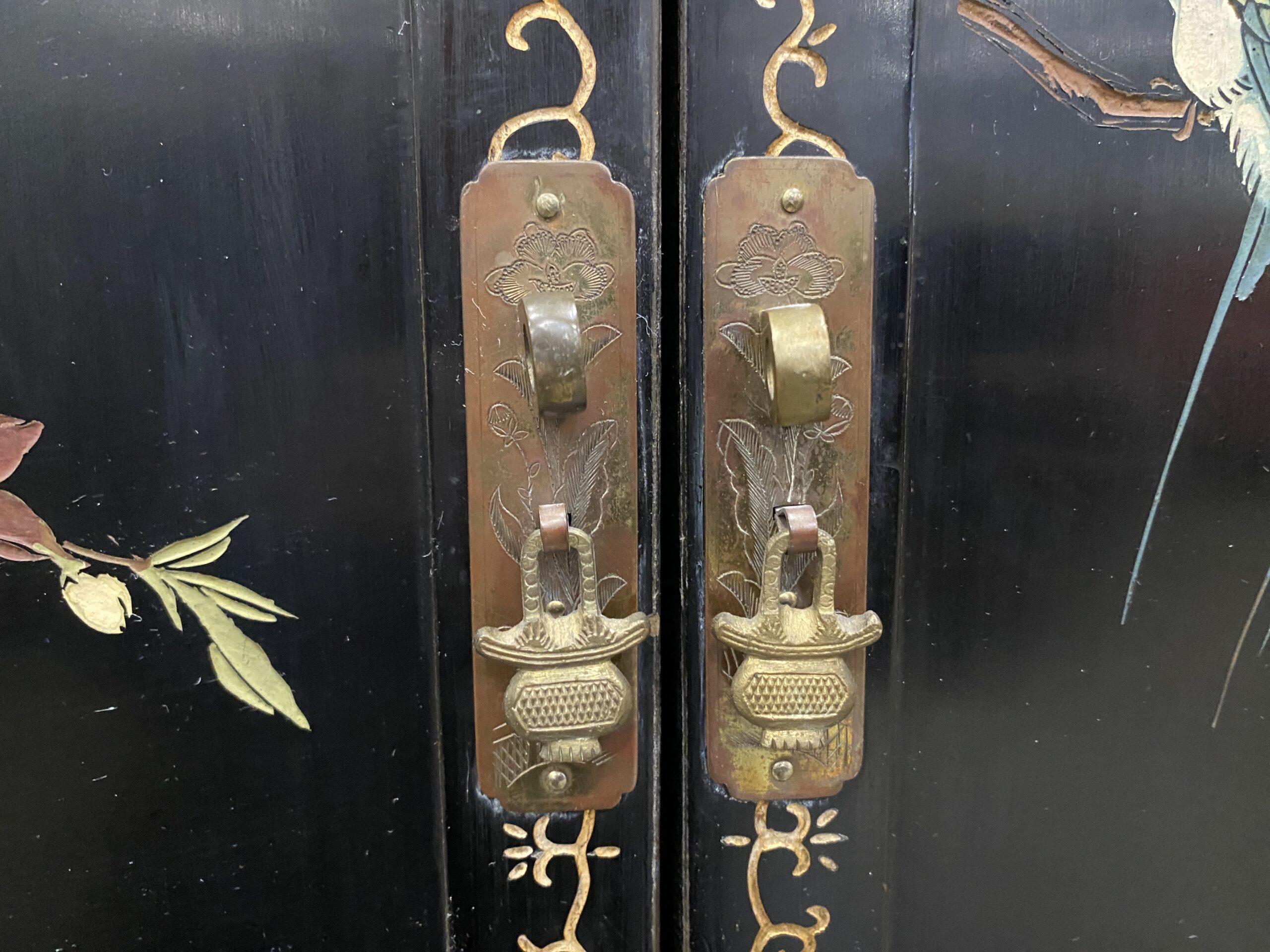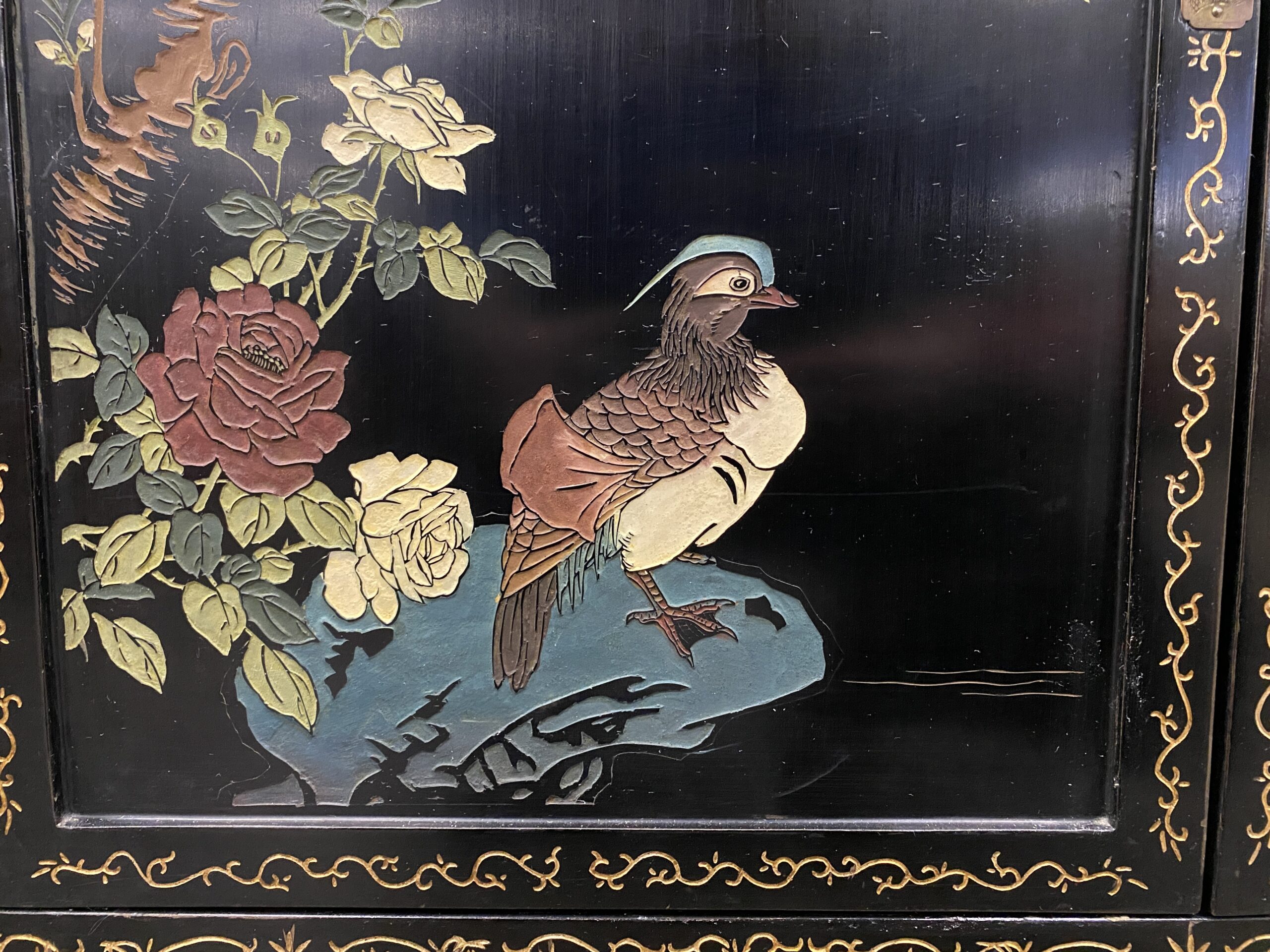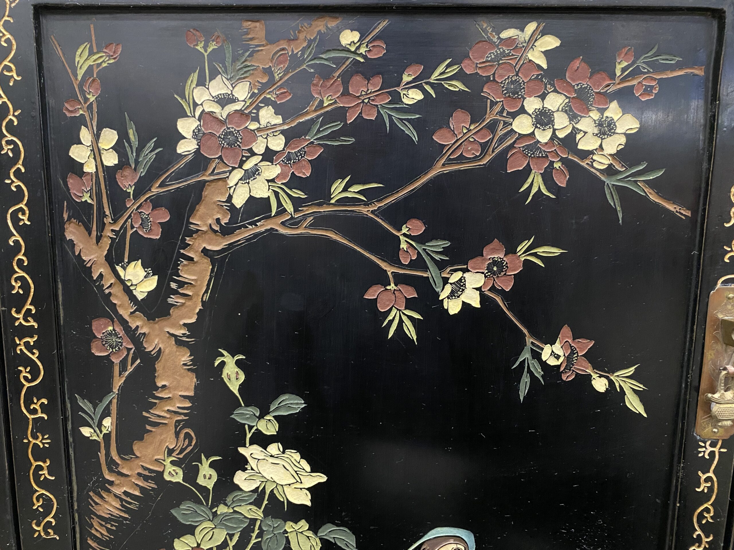 Black and Champagne Chinoiserie China Hutch with Glass Doors and Painted Details