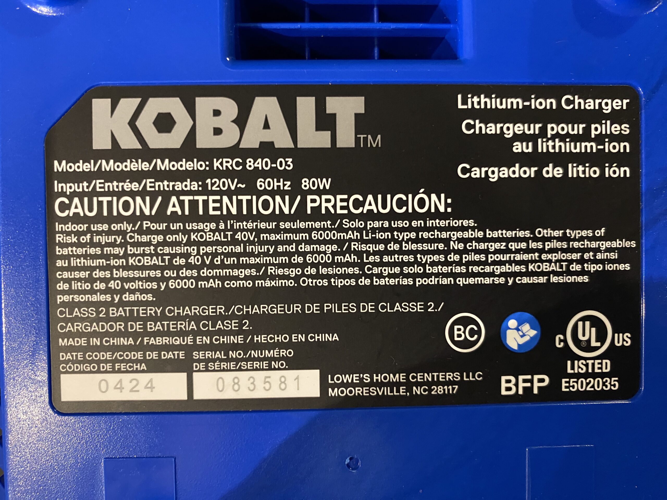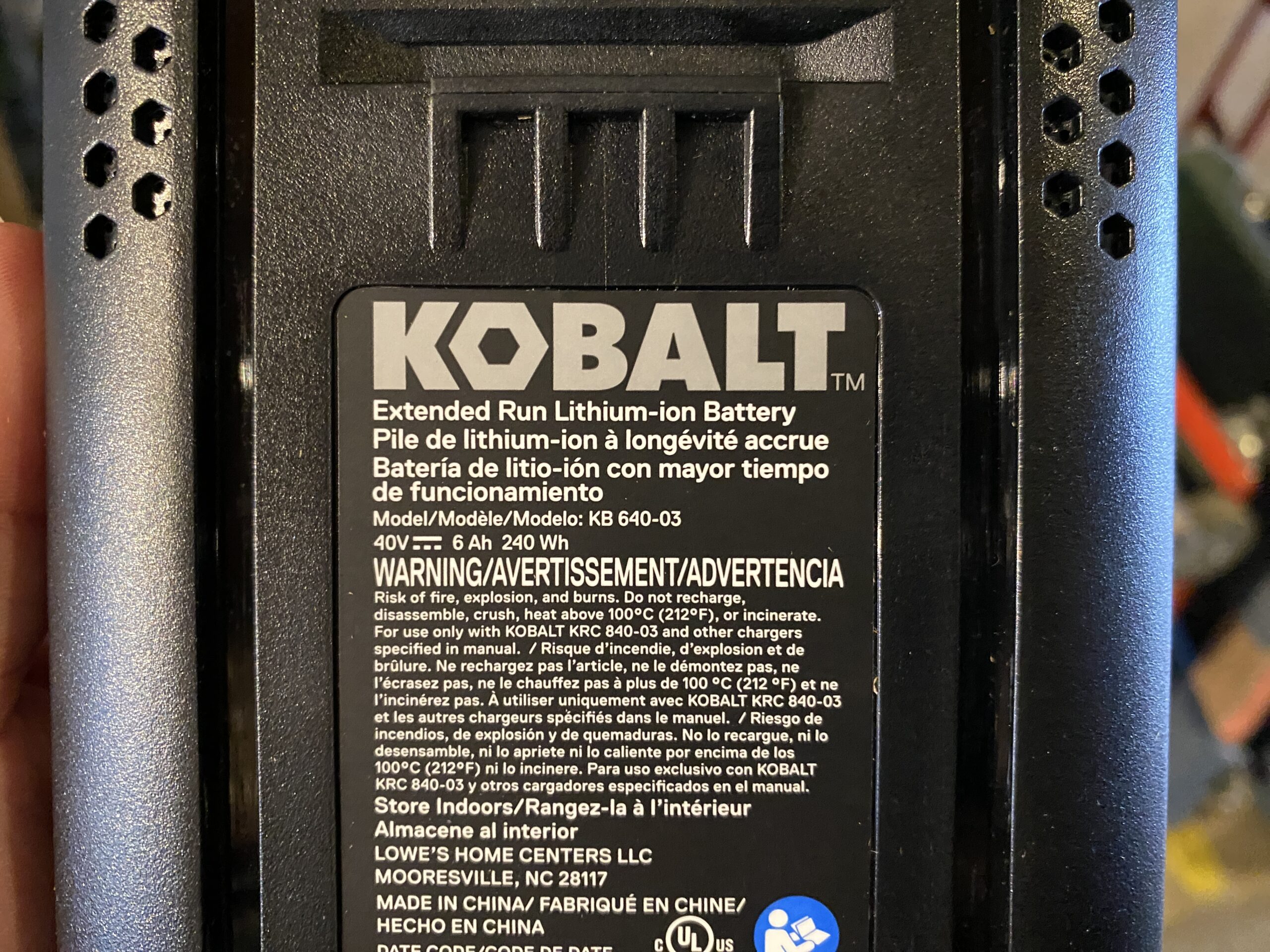 KOBALT 40V Lithium Ion 6Ah Battery & Charger Base Model #KRC 840-03
