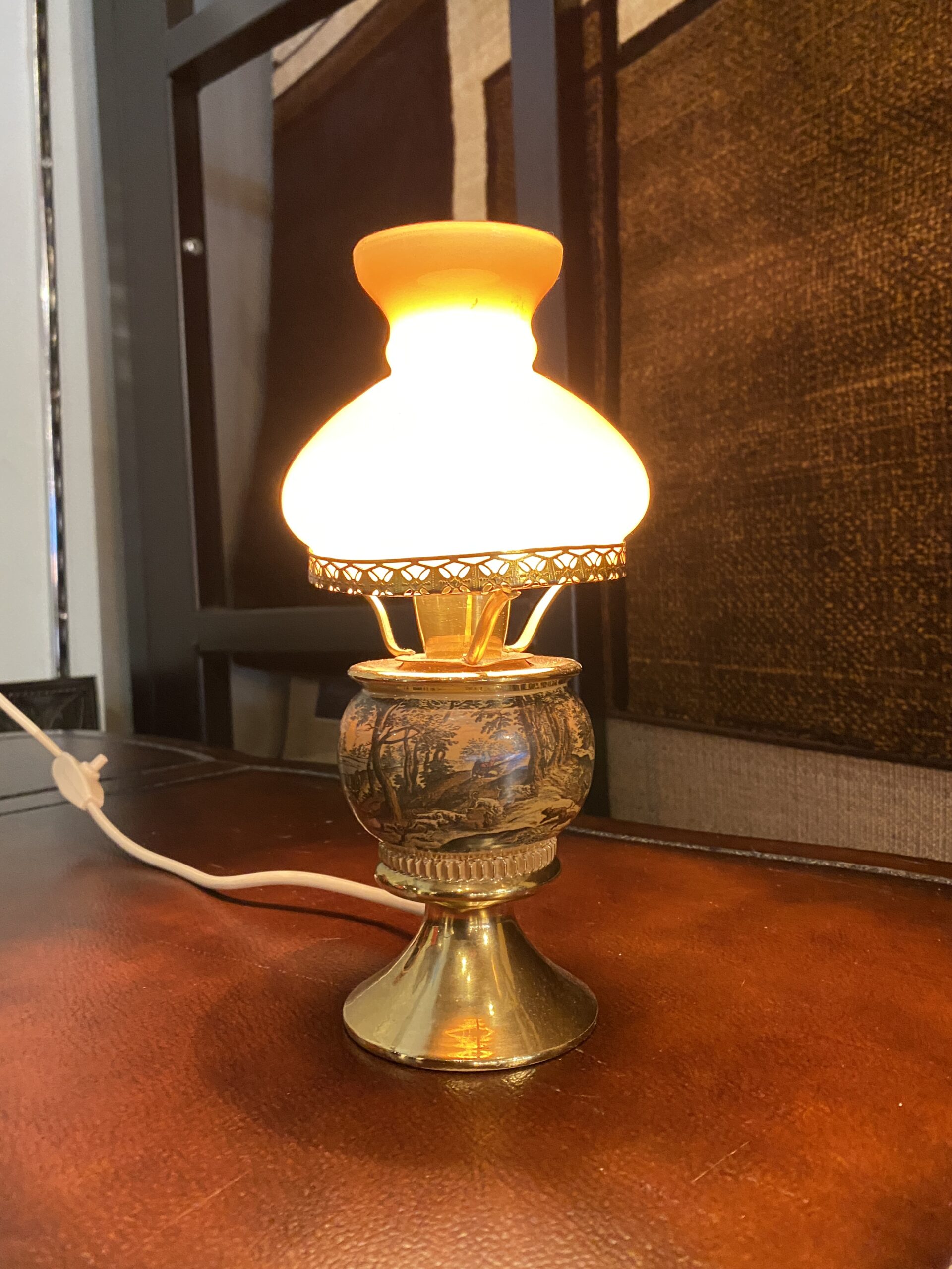 / Petite Vintage Murray Feiss Hunt Scene Hurricane Lamp