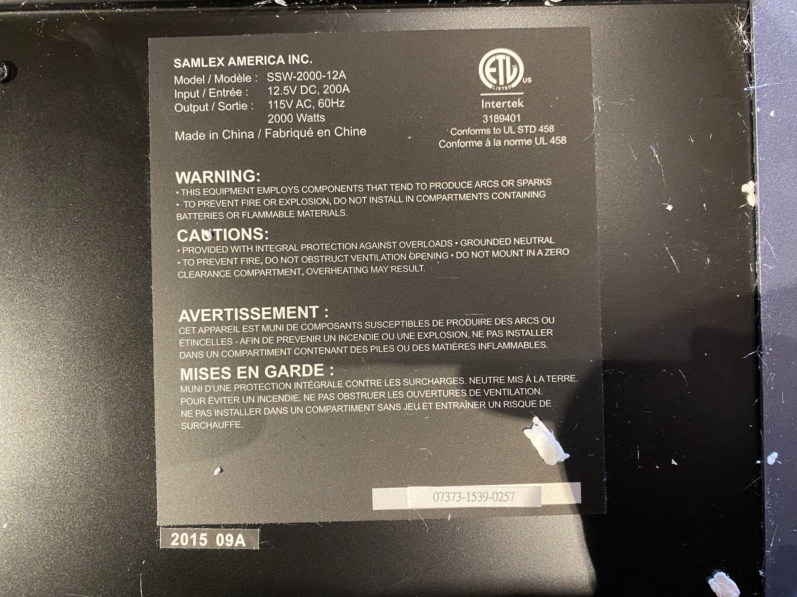 SAMLEX Inverter 2000 Watts Model #SSW-2000-12A